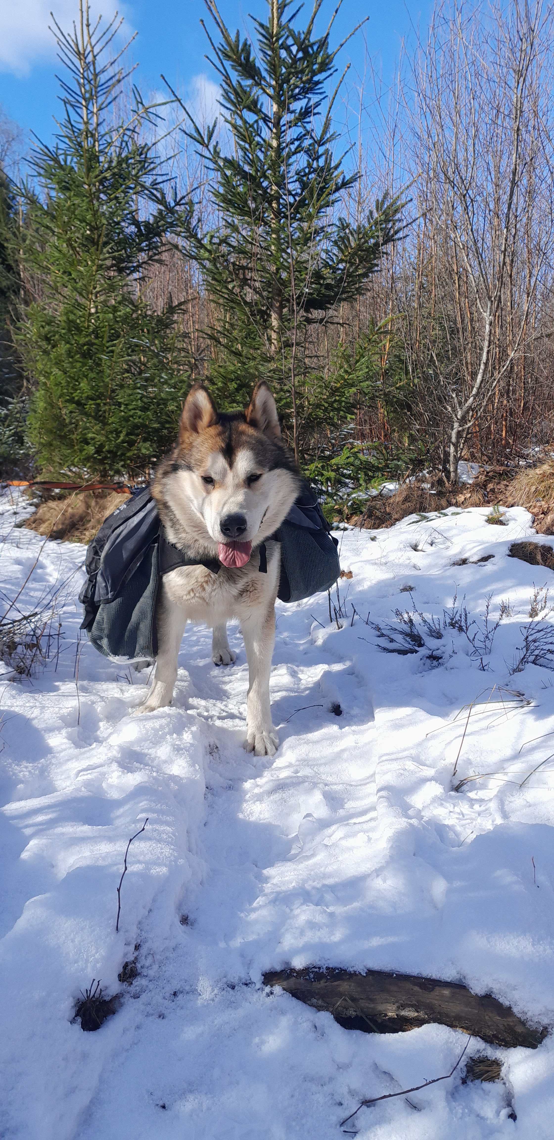 We are just in the beginning of training to carry a backpack ( Kløv) At the moment it’s Falk who is the dog in training. We are using a Non Stop Amundsen Pack at size XXL, it’s a BIG pack at 55L so there is room for a lot. As now we are just walking with 3-5kg in the pack on our 3-5km walks.